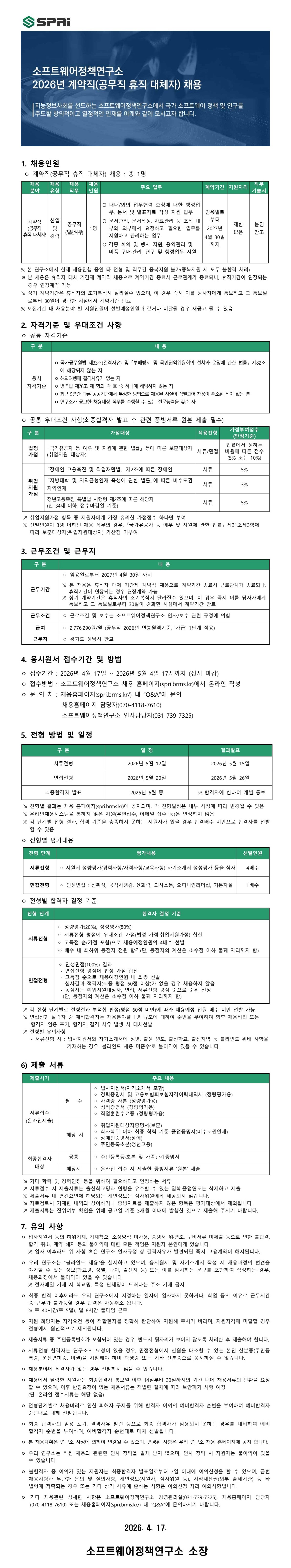 소프트웨어정책연구소 2026년 계약직(공무직 휴직 대체자) 채용